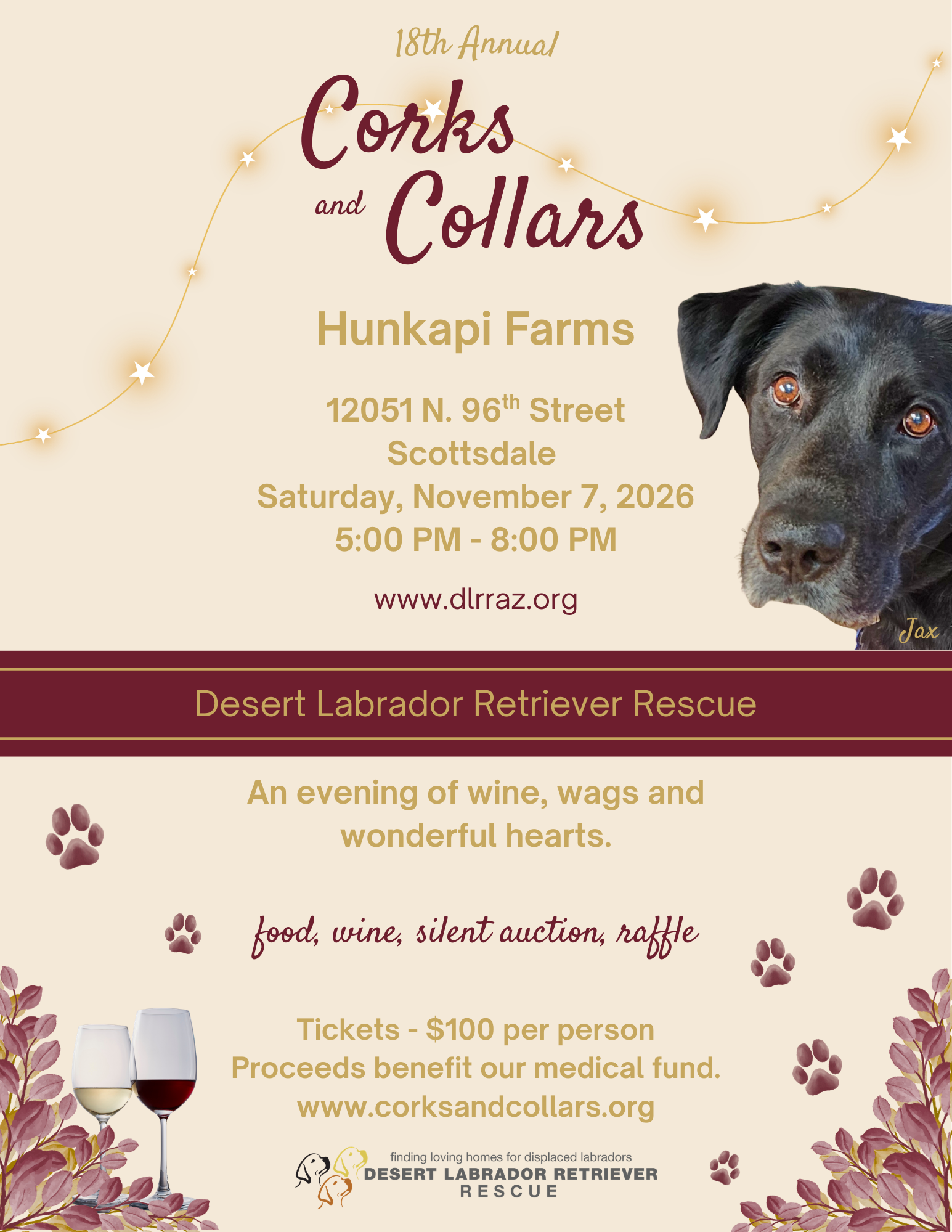 The 2026 Corks and Collars Gala and Silent Auction benefits the Desert Labrador Retriever Rescue (DLRR), a 501(c)(3) organization, and the many Labs we rescue, rehabilitate and rehome.